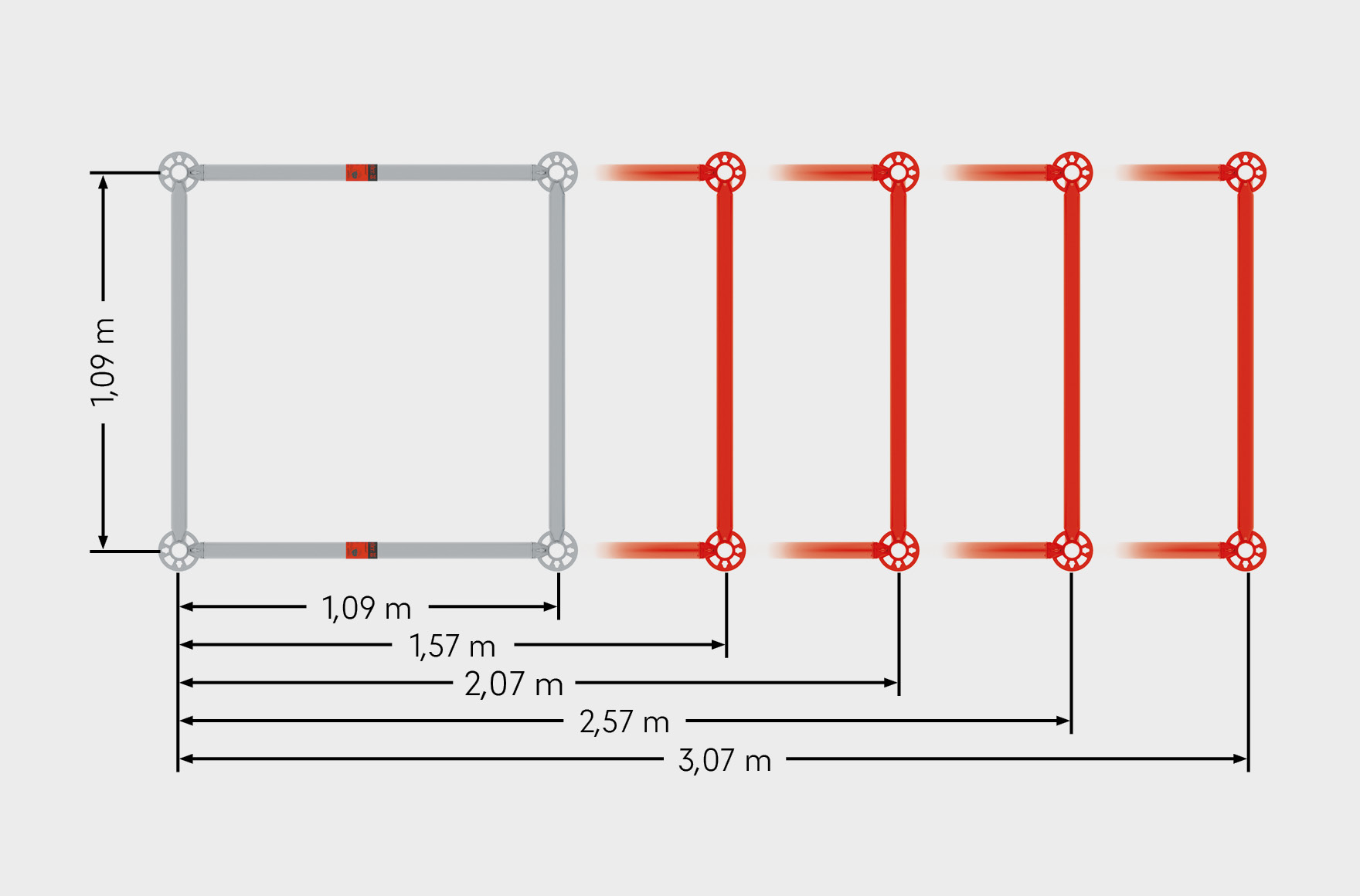 Durch die Verwendung von verschiedenen Allround Riegeln und Diagonalen kann der Traggerüstturm flexibel an Geometrie- und Lastanforderungen angepasst werden.