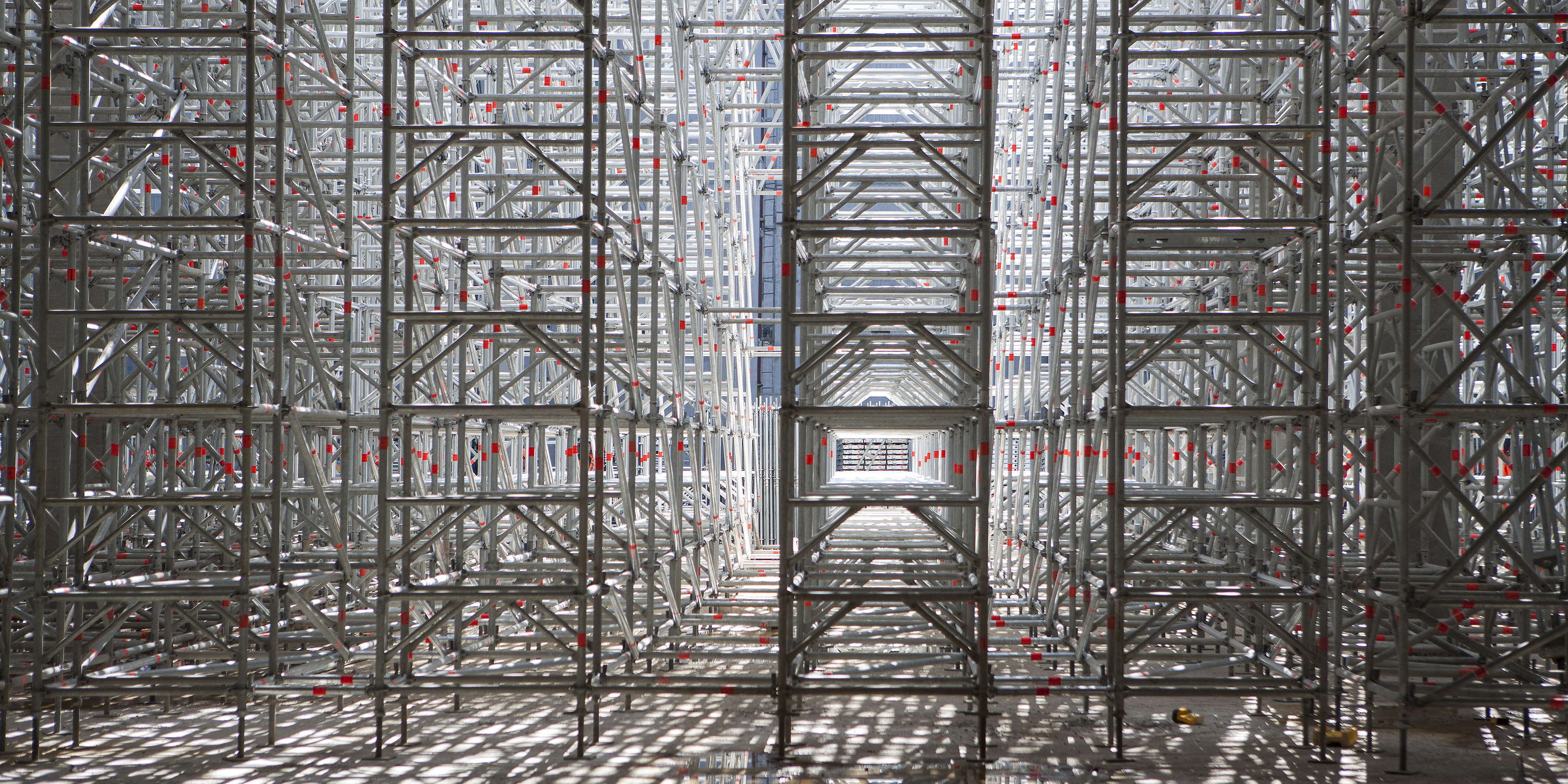 Traggerüsttürme TG 60 werden durch Allround Riegel und Diagonalen im Layher Systemmaß verbunden und ausgesteift und somit zum Raumgerüst ausgebaut. Dadurch entstehen sehr tragfähige Gerüstkonstruktionen – auch für sehr große Unterstützungshöhen.
