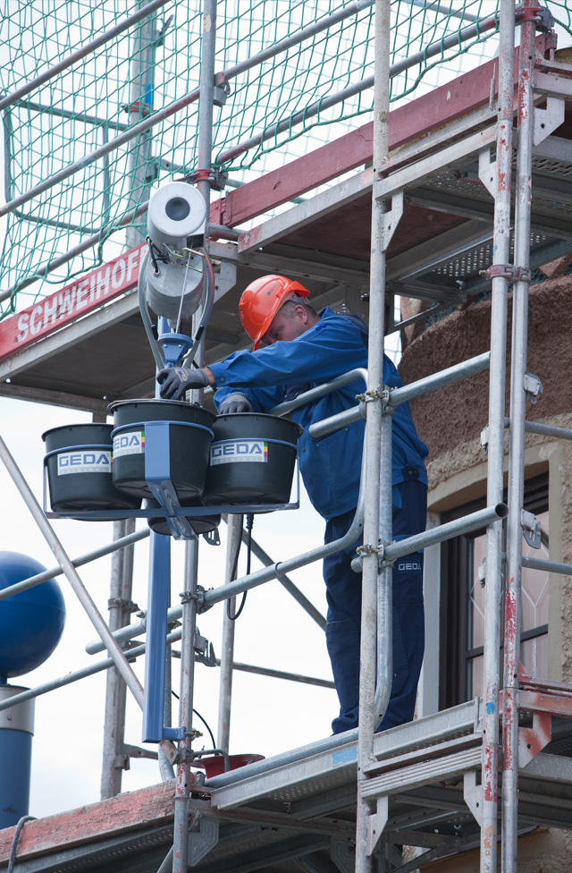 Die kompakten, ungeführten Schwenkarmaufzüge der GEDA Star-Serie werden dagegen an beliebiger Stelle am Gerüst, im Fenster, zwischen Geschossen oder am Dach eingesetzt.