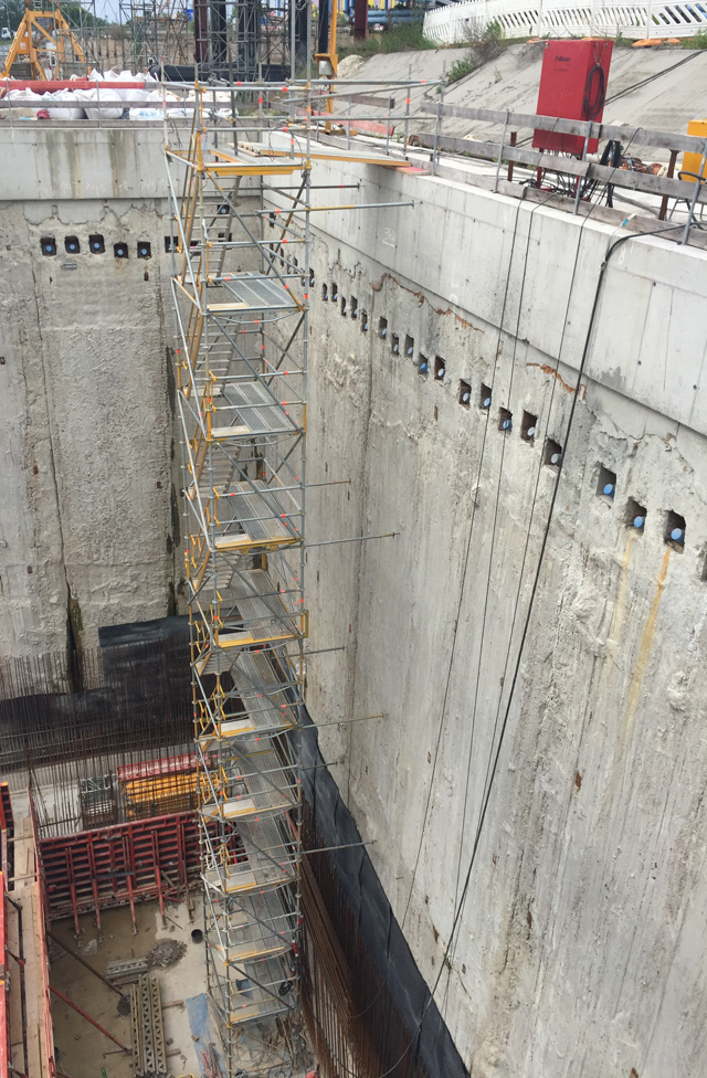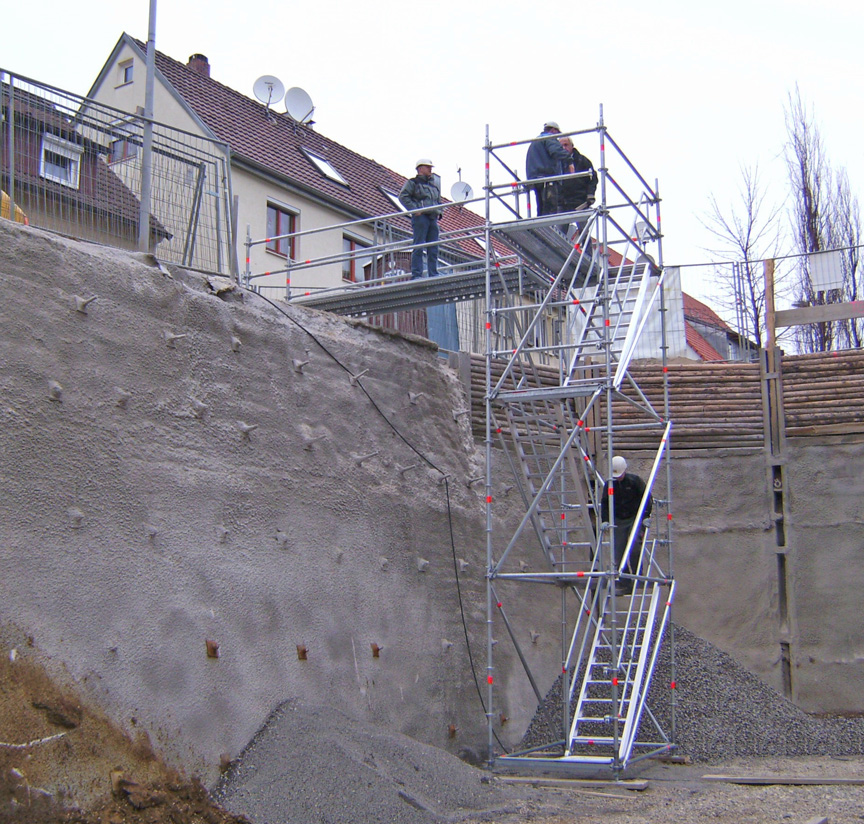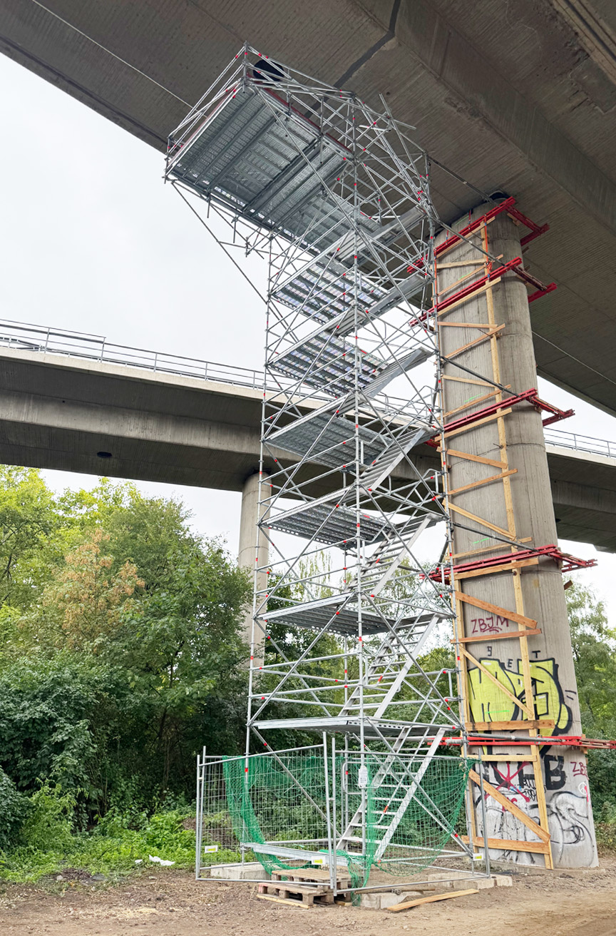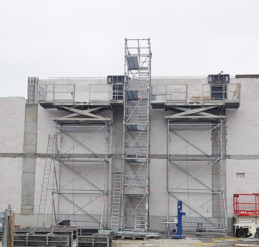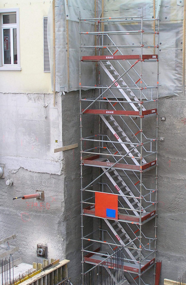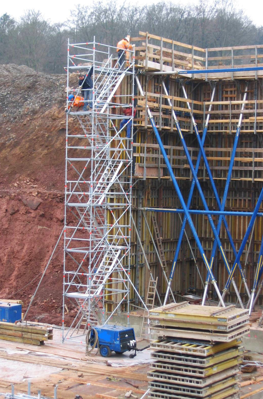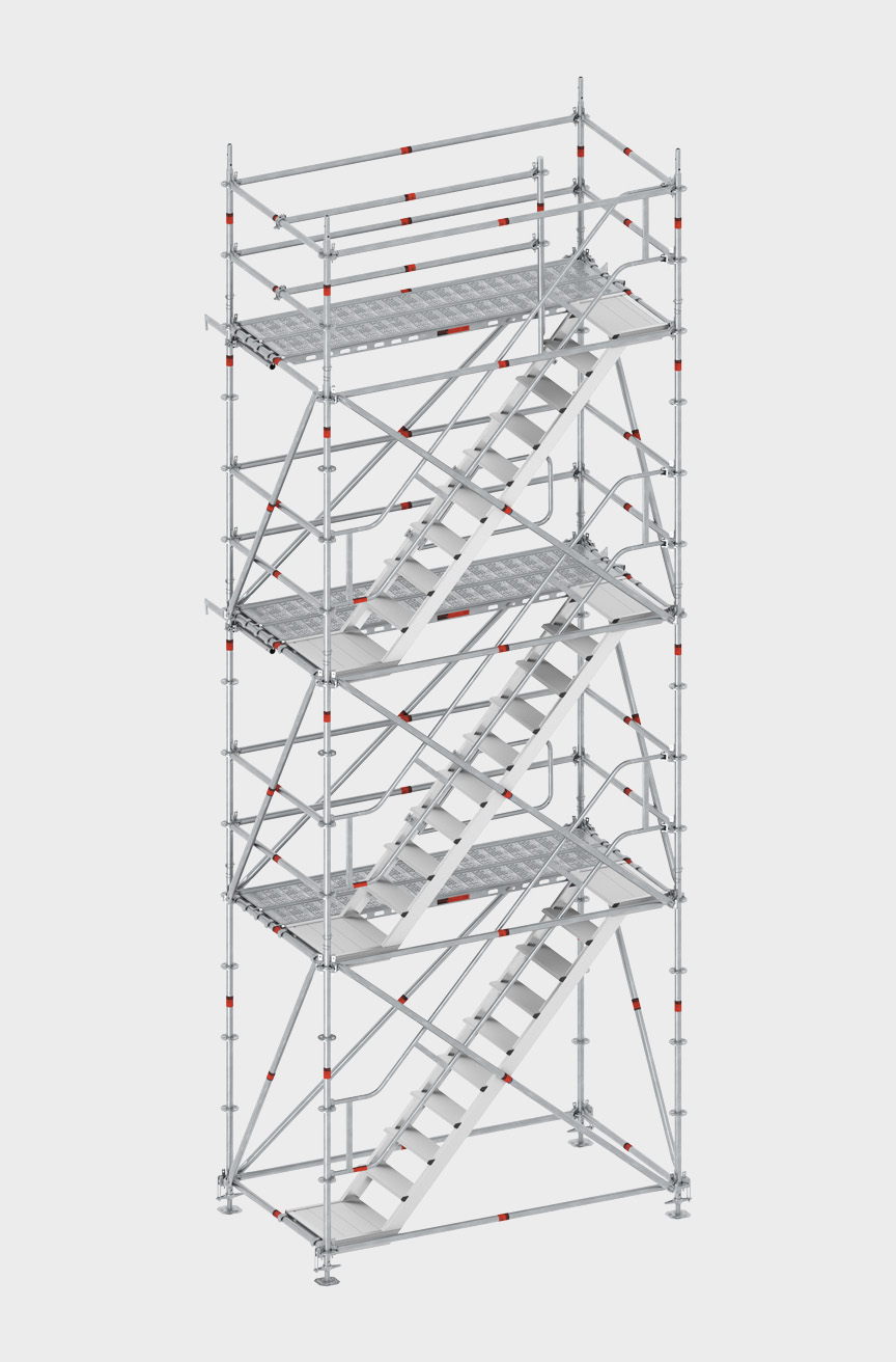 - als unabhängige Aufstiegskonstruktion (mit Verankerung) oder integriert in das Gerüst