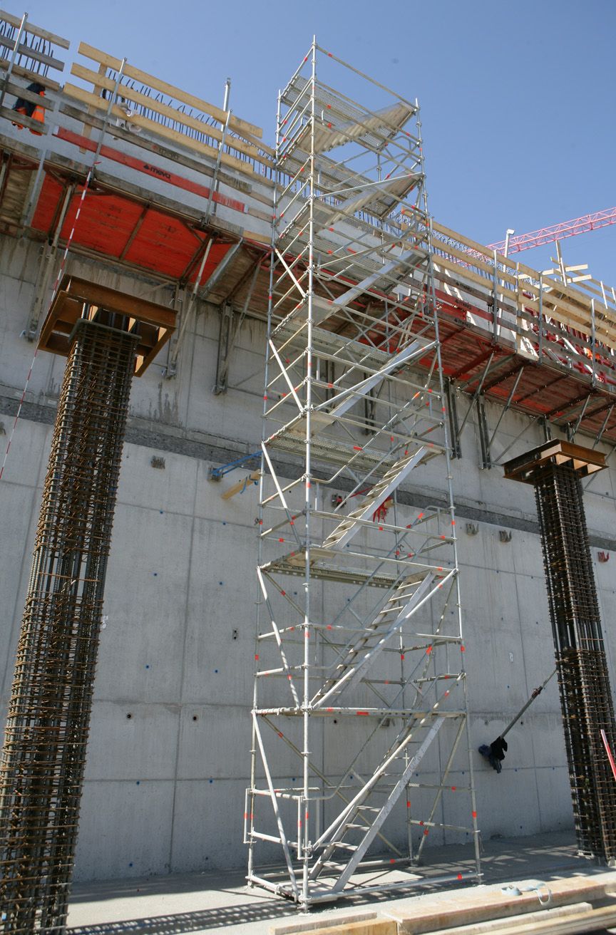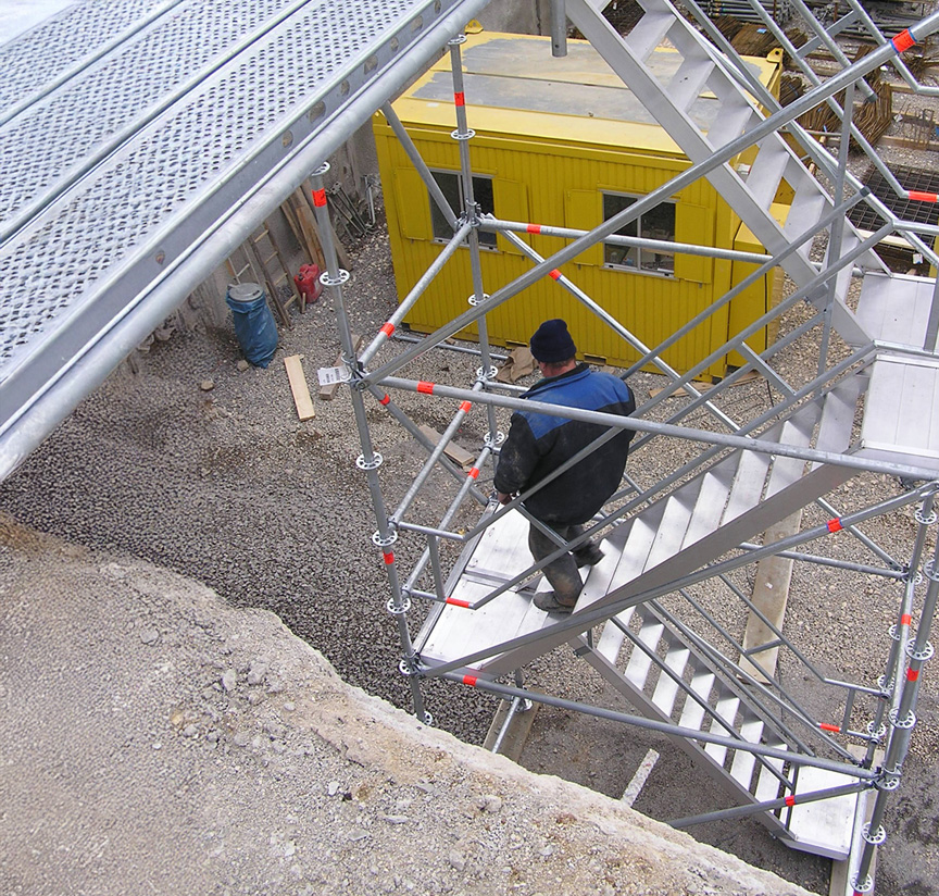 Ein komfortabler Auf- bzw. Abstieg zur Baustelle mit den Podesttreppen zum Layher Blitz- und AllroundGerüst. Bis zu 40 % Zeitersparnis gegenüber dem Auf- und Abstieg mit Leitern.