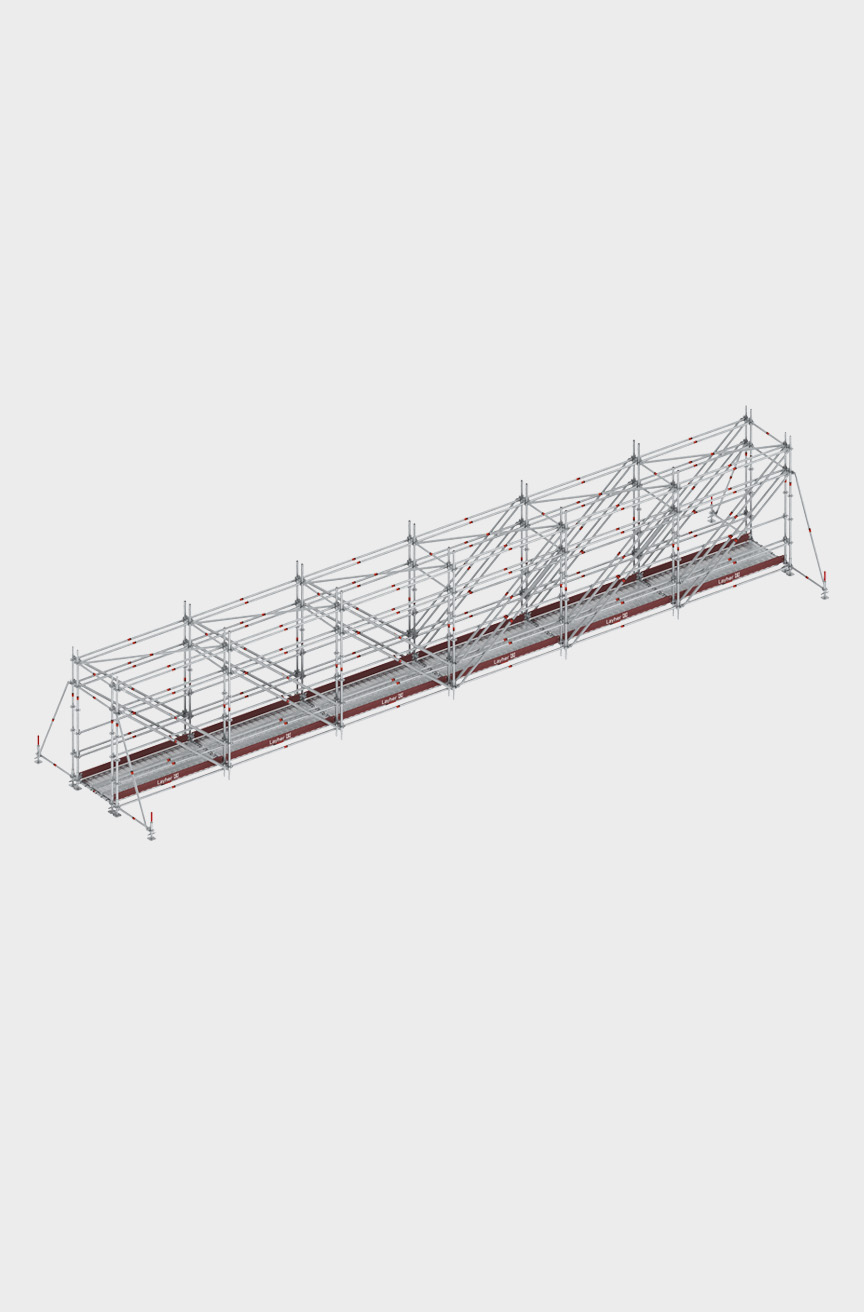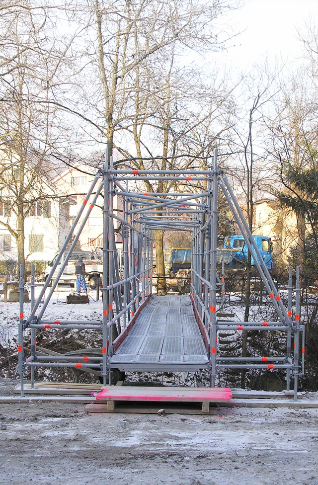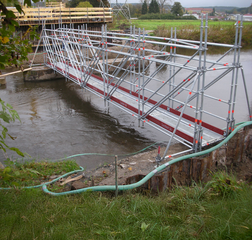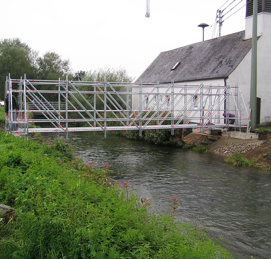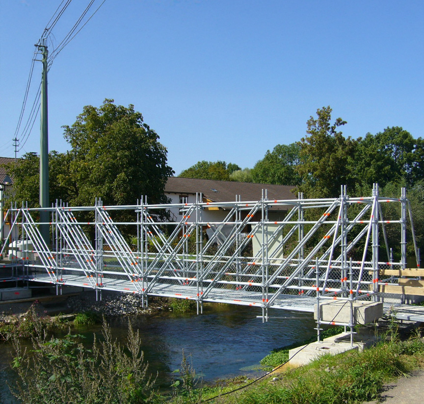 Wenn die einfache Grabenbrücke mit einer Belastung bis 2 kN / m² mal nicht ausreicht, erstellen wir Ihnen mit dem Layher AllroundGerüst auch Behelfsbrücken bis 5 kN / m².