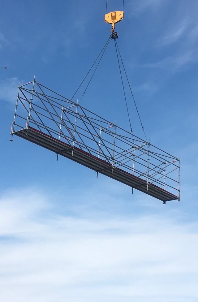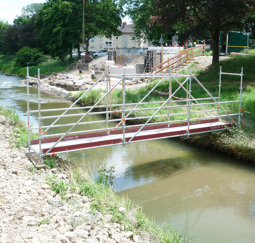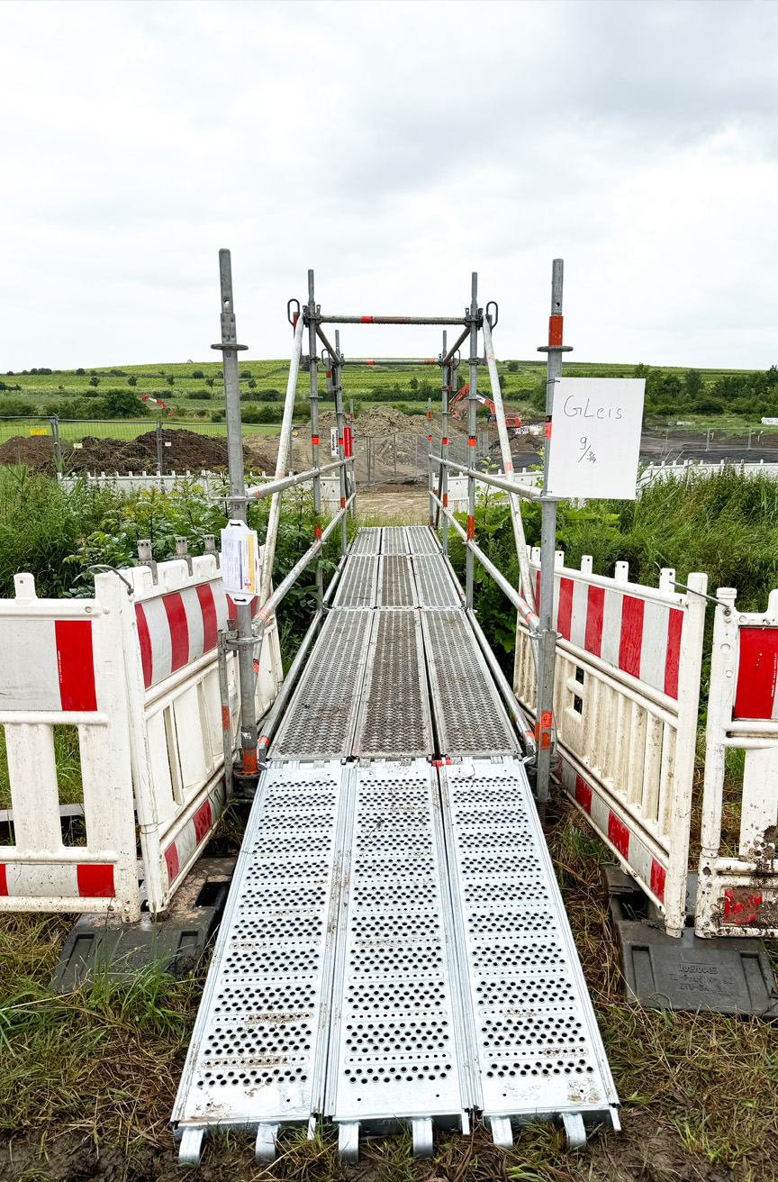 - Aufbau bis 4 Gerüstfelder L = 12,28 m/B = 1,09 m (längere Brücken siehe unter „Behelfsbrücken“)