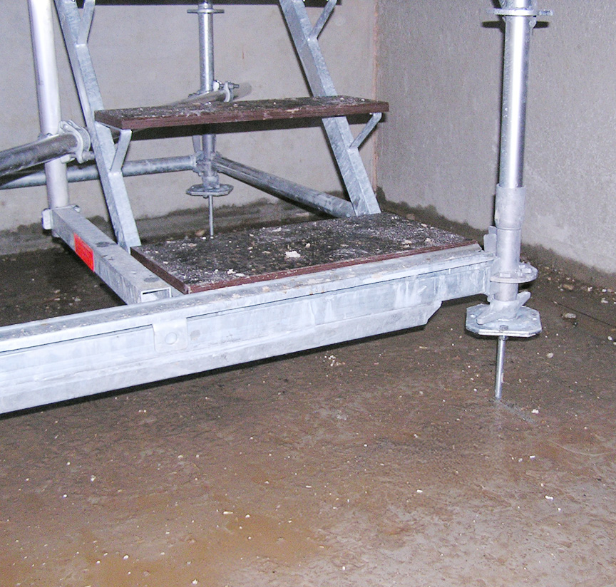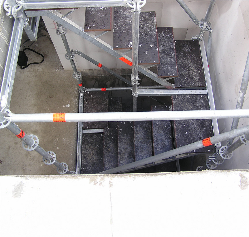 Die Layher Allround Rohbautreppe entspricht den Vorschriften „Treppen bei Bauarbeiten“ und passt in kleinste Treppenlöcher im Wohnungsbau.